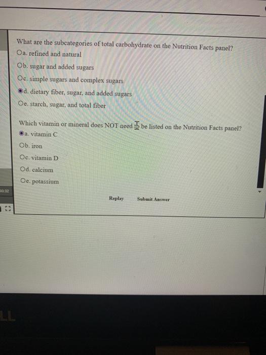 › homework-help › questions-andSolved J LUurse What are the subcategories of total | Chegg.com Question: J LUurse What are the subcategories of total carbohydrate on the Nutrition Facts panel? O a simple sugars and complex sugars b. sugar and added sugars c. refined and natural d. starch, sugar, and total fiber e. dietary fiber, sugar, and added sugars Which vitamin or mineral does NOT need to be listed on the Nutrition Facts panel? a.