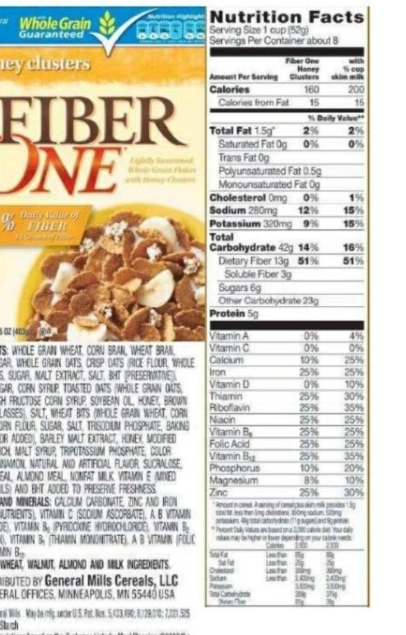 Honey Clusters Cereal • Fiber One * The % Daily Value (DV) tells you how much a nutrient in a serving of food contributes to a daily diet. 2,000 calories a day is used for general nutritional advice. ** Amount in cereal. A serving of cereal plus slim milk provides 1.5g total fat, less than 5mg Cholesterol, 250mg Sodium, 41g Total Carbohydrate (16g Total Sugars), 8g Protein, 1 ...