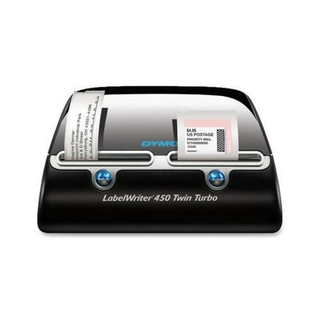 Dymo LabelWriter 450 Twin Turbo Desktop Label Printer (1752266) | Staples Dimensions: 5.33"H x 8.5"W x 7.38"D 2-year manufacturer limited warranty Two Label Rolls Maximize Efficiency Thanks to the LabelWriter 450 Twin Turbo's two label rolls, you won't have to swap out rolls for different applications. The LabelWriter 450 also prints up to 71 labels per minute so labels print quickly. Get Stamps Without Paying a Fee