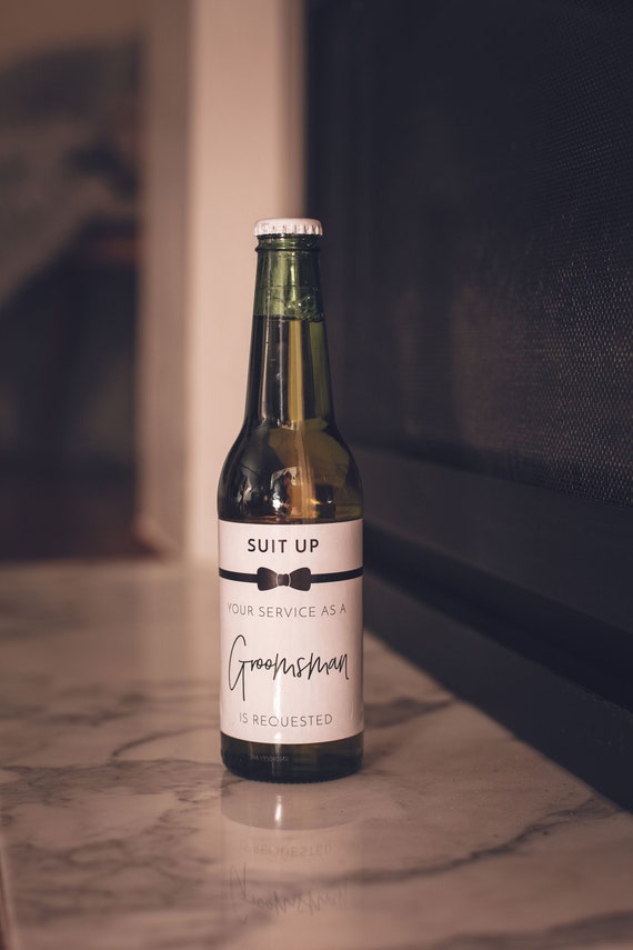 Suit Up - Will You Be My Groomsman Decorations for Men - 6 Beer Bottle ... Carefully peel one Will You Be My Groomsman sticker label from the backing and adhere to a bottle, starting at the edge and rolling to the opposite edge. Add the bottle neck label and place the completed bottle into the kraft paper carrier. Complete the beer gift kit by adding the remaining 4 stickers to the sides of the six-pack carrier.
