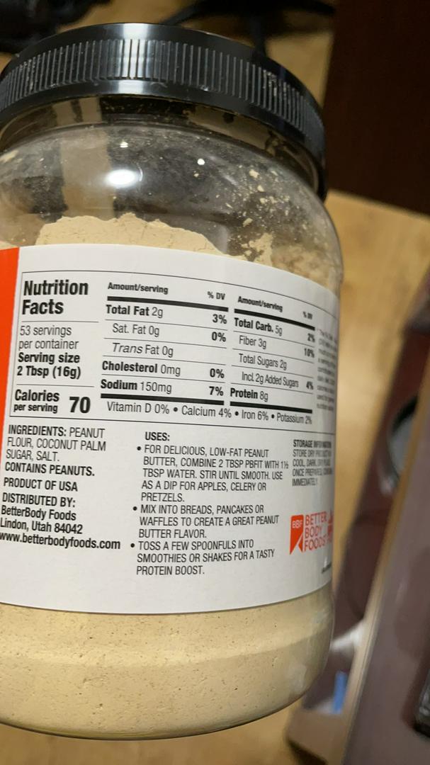 PBfit All-Natural Peanut Butter Powder, 8g Protein, 15 oz - Walmart.com Nutrition facts. Refer to the product label for full dietary information, which may be available as an alternative product image. 35 Servings Per Container. Serving Size 12 G. ... PBfit® is packaged at BetterBody Foods' world headquarters in Lindon, Utah. BetterBody Foods, PBfit All-Natural Peanut Butter Powder, 8g Protein, 15 oz. PBFIT, Peanut Butter Powder, 24 oz. (3 Count) - amazon.com Product Description. PBfit is everything you love about peanut butter, made better. This 24 oz. bottle contains 42 servings! Whole-roasted peanuts, pressed to perfection, means PBfit contains 87% less fat than traditional peanut butter, and about 1/3 the calories. PBfit Pure Peanut - BetterBody Foods PBfit Pure Peanut - BetterBody Foods PBfit® Pure Peanut That's right, pure peanut protein, undressed and fully exposed. No sugar, no salt, only roasted peanuts that are pressed to perfection to remove most of the fat and leave behind peanut protein deliciousness. Ingredients Peanut Flour SHOP NOW WHY PBfit Pure Peanut? WHERE IT'S FROM Peanut butter powder by PBFIT nutrition facts and analysis. Peanut butter powder by PBFIT contains 50 calories per 12 g serving. This serving contains 1.5 g of fat, 6 g of protein and 4 g of carbohydrate. The latter is 2 g sugar and 2 g of dietary fiber, the rest is complex carbohydrate. ... Nutrition labels presented on this site is for illustration purposes only. Food images may show a similar or a ...