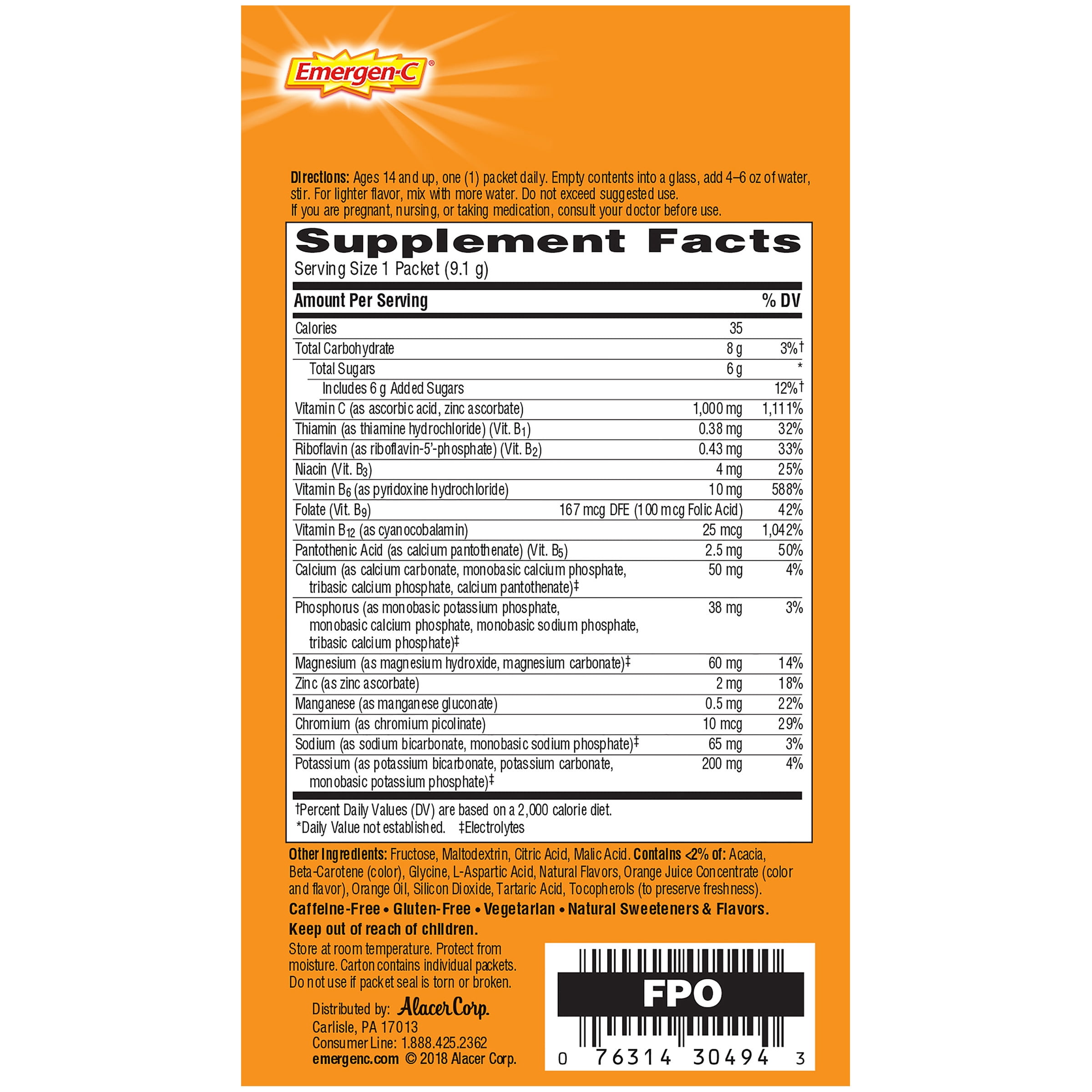 Amazon.com: emergen c packets Emergen-C 1000mg Vitamin C Powder for Daily Immune Support Caffeine Free Vitamin C Supplements with Zinc and Manganese, B Vitamins and Electrolytes, Super Orange Flavor - 30 Count ... Extra 25% off when you subscribe Extra 25% off when you subscribe. First Delivery Sat, Oct 8. Best Seller in Vitamin C Supplements.