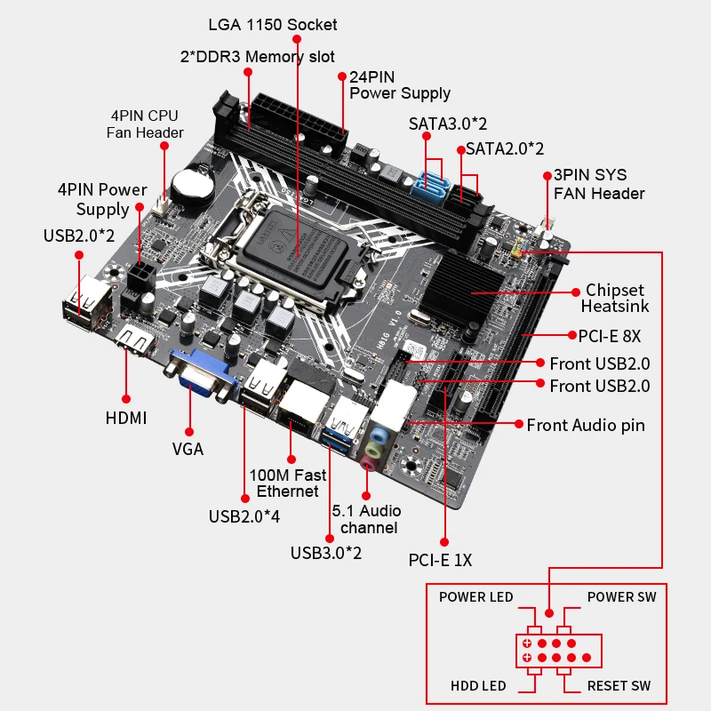 Dissecting the Modern Motherboard: Connectors, Ports & Chipsets ... Jun 27, 2018 ... Motherboard Diagram · 1. CPU socket · 2. Chipset · 3. DIMM/RAM slots · 4. PCIe x16 slot · 5. PCI x1 slot · 6. M.2 connector · 7. SATA ports · 8. Front ...