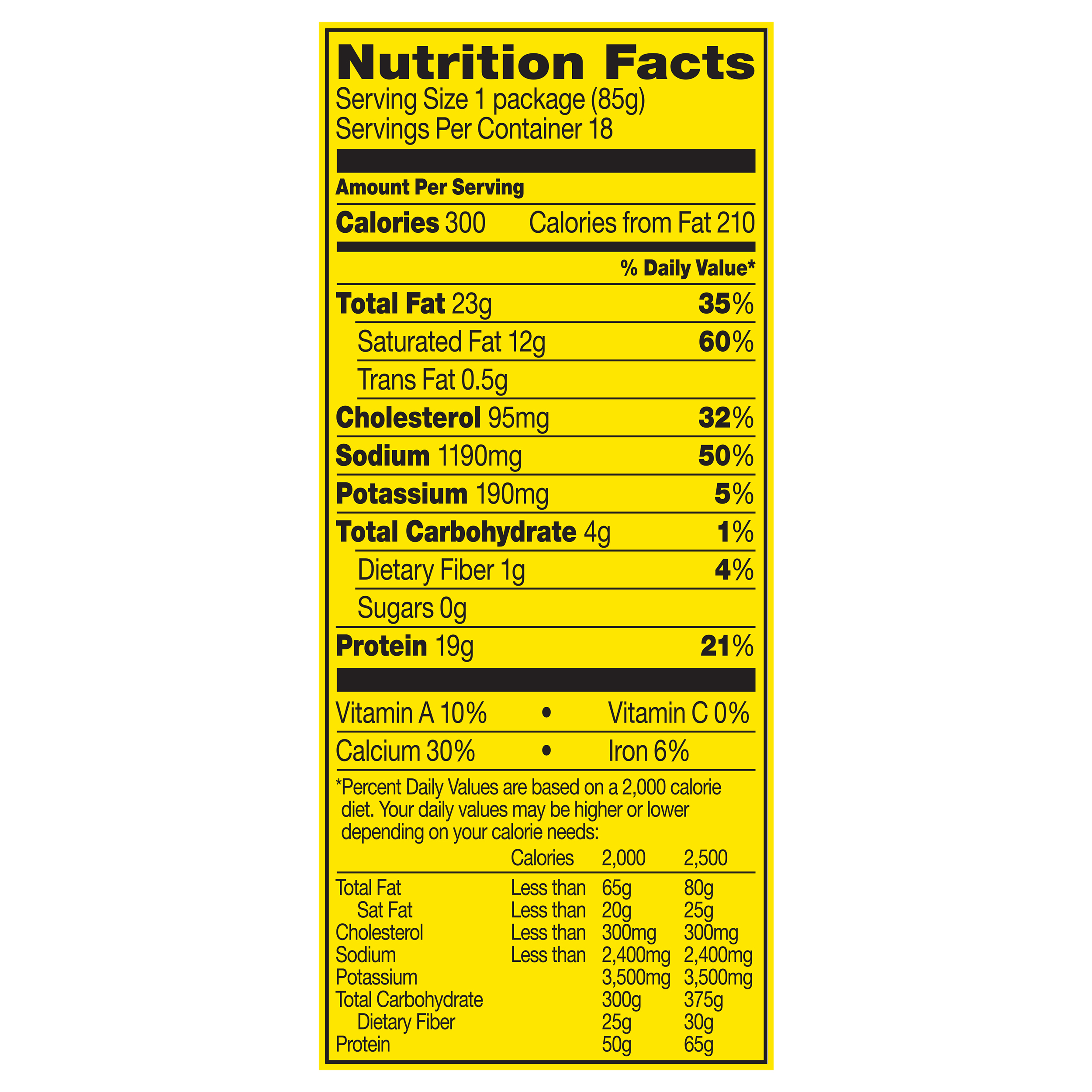 Slim Jim Nutrition Facts & Calories - Inlivo Contains a high amount of risky components that may include saturated fat, cholesterol, sodium and sugars (0.06%/oz). Good source of proteins (66% of DV/100g). Relatively high in saturated fat (54% of DV/100g). Calories in 1 Cup, Pieces (3.2 oz) 369 calories / 207 from fat Carbohydrates 9.9 g Proteins 30 g Fat 23 g Saturated Fat 9.8 g Calories Slim Jim Nutrition Facts. Calories, carbs, fat, sodium & more ... Slim Jim Mild Snack Stick Short sticks. 4 packages (32g) Nutrition Facts. 150 calories. Log food. Slim Jim Original Snack Stick Giant. 1 package (27.5g) Nutrition Facts. 130 calories. Slim jim snack-sized smoked meat stick, original flavor, .28 oz. by ... Slim jim snack-sized smoked meat stick, original flavor, .28 oz. by Conagra Brands contains 90 calories per 13 g serving. This serving contains 7 g of fat, 4 g of protein and 2 g of carbohydrate. The latter is 0 g sugar and 1 g of dietary fiber, the rest is complex carbohydrate. Calories in Slim Jim - Tops Big Boy Sandwich - Calorie, Fat, Carb ... Full nutritional breakdown of the calories in Slim Jim - Tops Big Boy Sandwich based on the calories and nutrition in each ingredient, including Bolillo Buns -( Ingles ) Serving 1 Bun, Ham, extra lean, (5% fat), Swiss Cheese - Kroger Fat Free, Olive Oil, Catsup and the other ingredients in this recipe. ... 10 calories of Kraft Miracle Whip Fat ...