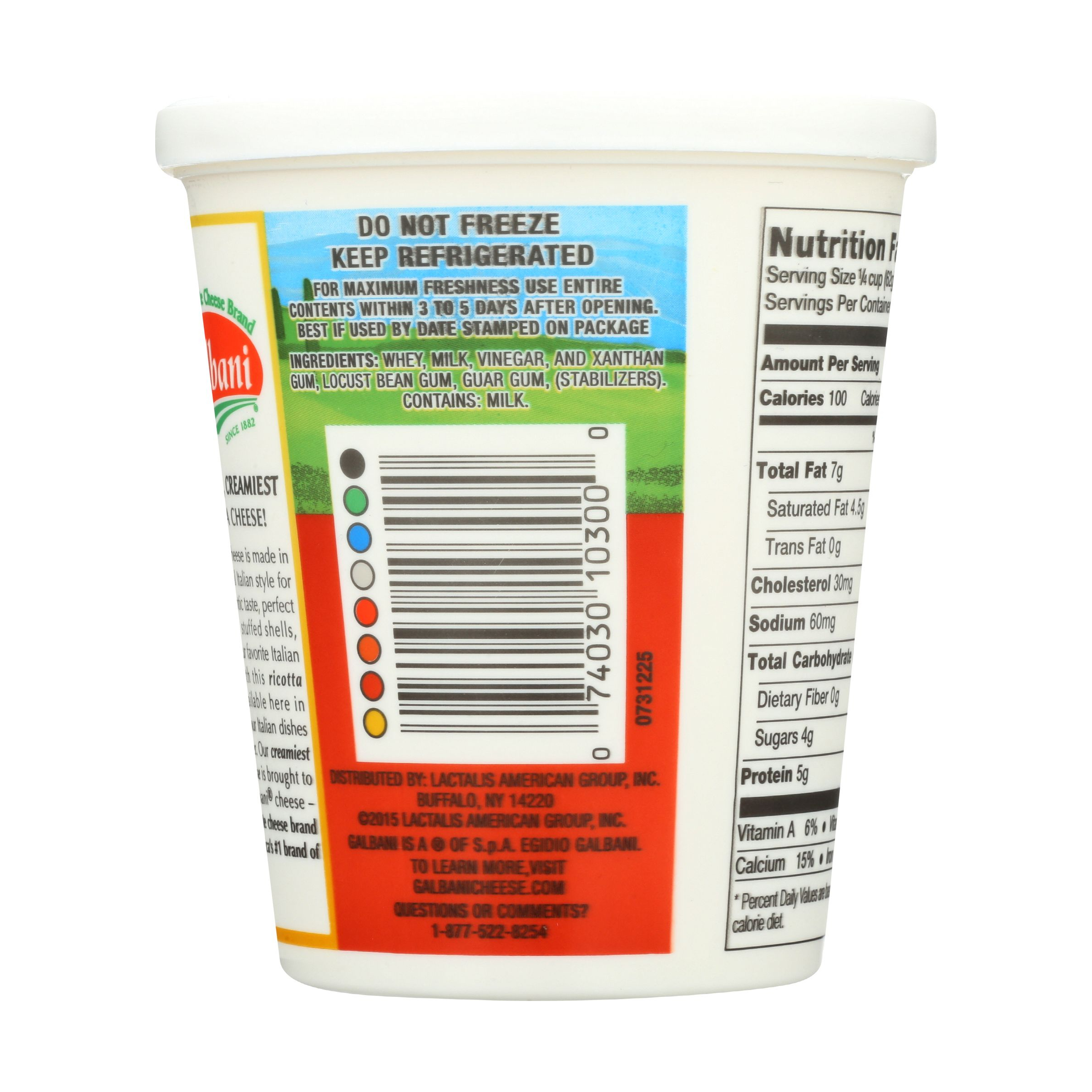 Galbani Part Skim Ricotta Cheese, 32 oz - Foods Co. Nutritional Information ; Cholesterol25mg8.33% ; Sodium65mg2.71% ; Protein5g ; Calcium150mg15% ; Iron0mg0%.