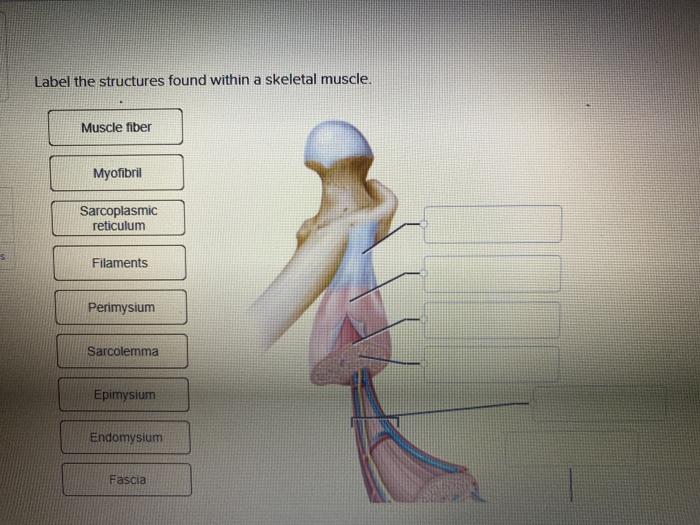 Muscles & Muscle Tissue 1) Label the structures of a ... 1) Label the structures of a skeletal muscle. Epimysium. Bone. Tendon. Perimysium. Fascicle. Blood vessel. Muscle fiber. Endomysium. Source Lesson: Muscles: ... Structure of Skeletal Muscle Each muscle is surrounded by a connective tissue sheath called the epimysium. Fascia, connective tissue outside the epimysium, surrounds and separates the ...